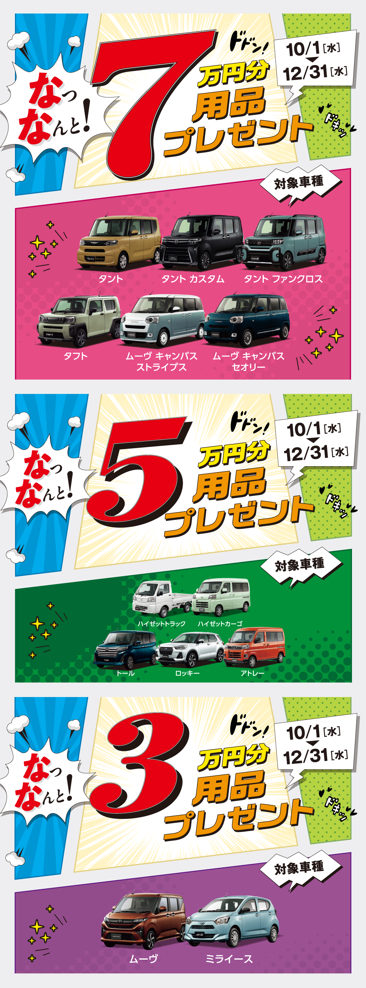 ■2025年10月1日~12月31日までに、対象車種の新車と用品をセットでご成約の上、2026年2月末日までに届け出いただくことを条件に割引をいたします。詳細は以下の通りです。■【用品7.7万円割引】対象車種:タント・タントファンクロス・タフト・ムーヴキャンバス 新車と同時に注文いただいた用品の金額が77,000円(税込)に満たない場合は対象外となります。■【用品5.5万円割引】対象車種:トール・ロッキー・アトレー 新車と同時に注文いただいた用品の金額が55,000円(税込)に満たない場合は対象外となります。■【用品3.3万円割引】対象車種:ムーヴ・ミライース・ハイゼットトラック・ハイゼットカーゴ 新車と同時に注文いただいた用品の金額が33,000円(税込)に満たない場合は対象外となります。■既に成約済みの車両にさかのぼって適用することはできません。■販売会社によって、期間・内容・条件・対象用品が異なる場合がございます。■一部の店舗では実施していない場合がございます。■詳しくは販売会社スタッフへお問い合わせください。